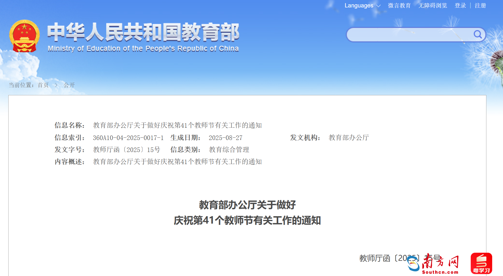 2025年9月10日是我国第41个教师节,教育部公布今年教师节主题为“以教育家精神铸魂强师,谱写教育强国建设华章”。