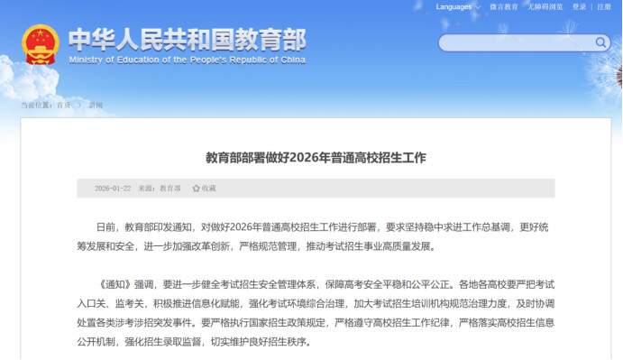 刚刚,教育部发布《关于做好2026年普通高校招生工作的通知》,对2026年普通高校招生工作进行部署,2026年高考全国统考将于6月7日、8日举行。