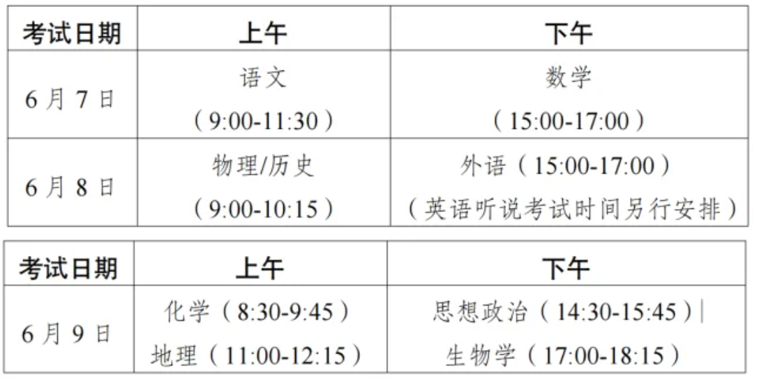 6月8日:文科综合/理科综合(9:00-11:30)、外语(15:00-17:00),有外语听力测试内容的一般应安排在外语笔试考试开始前进行。