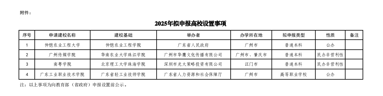 据《中华人民共和国高等教育法》《普通本科学校设置暂行规定》《高等职业学校设置标准(暂行)》《教育部关于“十四五”时期高等学校设置工作的意见》《教育部办公厅关于加快推进独立学院转设工作的实施方案》等有关规定,为做好2025年拟申报高校设置事项相关工作,经省高等学校设置评议委员会专家考察和评议,现对拟向教育部(省政府)申报的仲恺农业工程学院更名为仲恺农业工程大学、华南农业大学珠江学院转设为广州传媒学院、北京理工大学珠海学院转设为南粤学院、以广东省轻工业技师学院为基础设立广东工业职业技术学院等4个事项予以公示。公示时间为2025年10月10日至2025年10月15日。