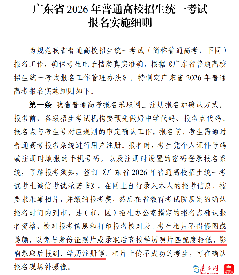 特别强调,考生相片不得修图或美颜,以免与身份证照片或录取后高校学历照片匹配度较低,影响录取后报到、学历注册等。