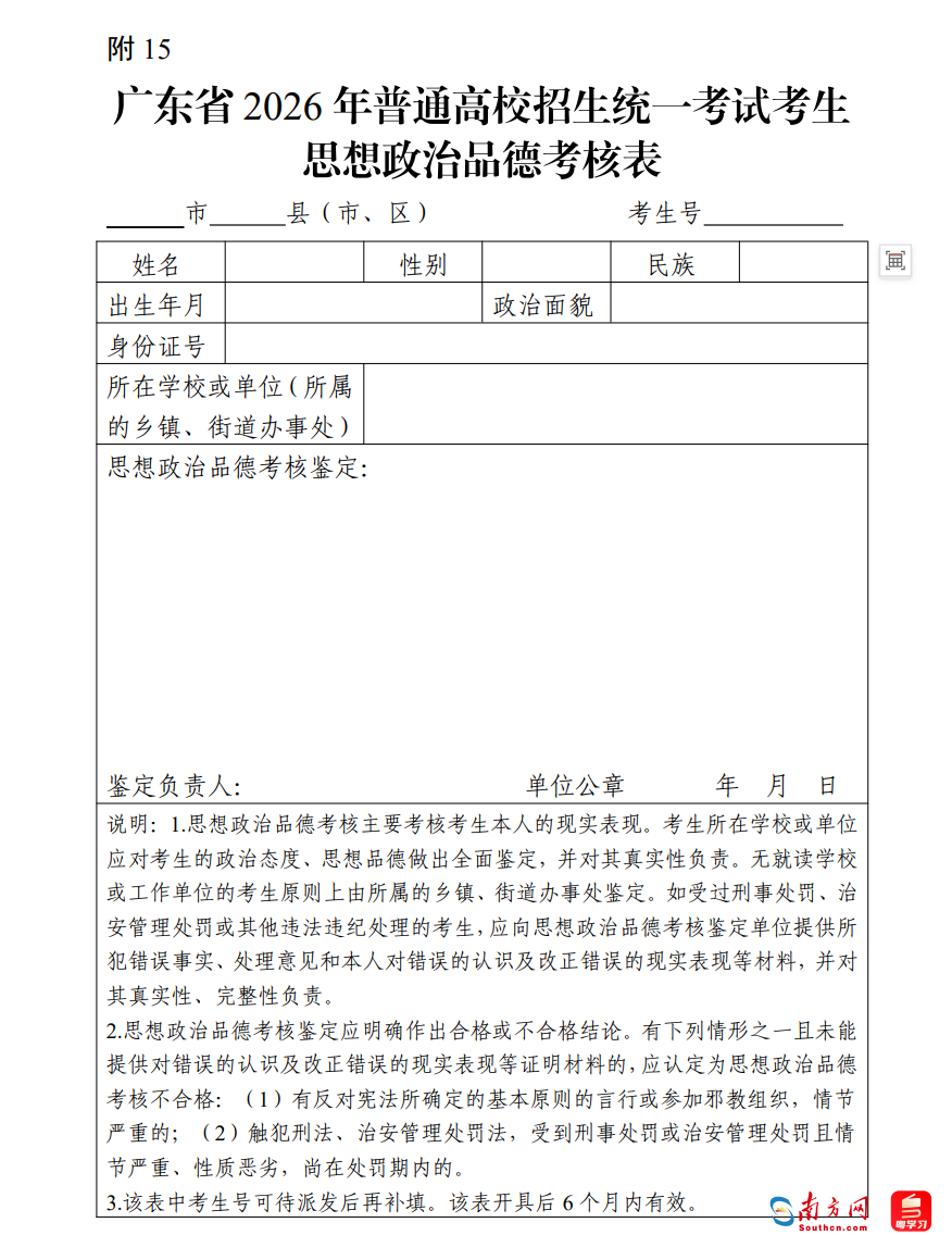 2026年高考报名新增了思想政治品德考核。对省内高中应届毕业生而言,可使用《广东省中学生德育考核表》作为思想政治品德考核鉴定材料。而其他考生则需要在高考报名前,向所在学校或单位(所属的乡镇、街道办事处)申请办理《广东省 2026年普通高校招生统一考试考生思想政治品德考核表》,在现场确认报名时交至报名点。
