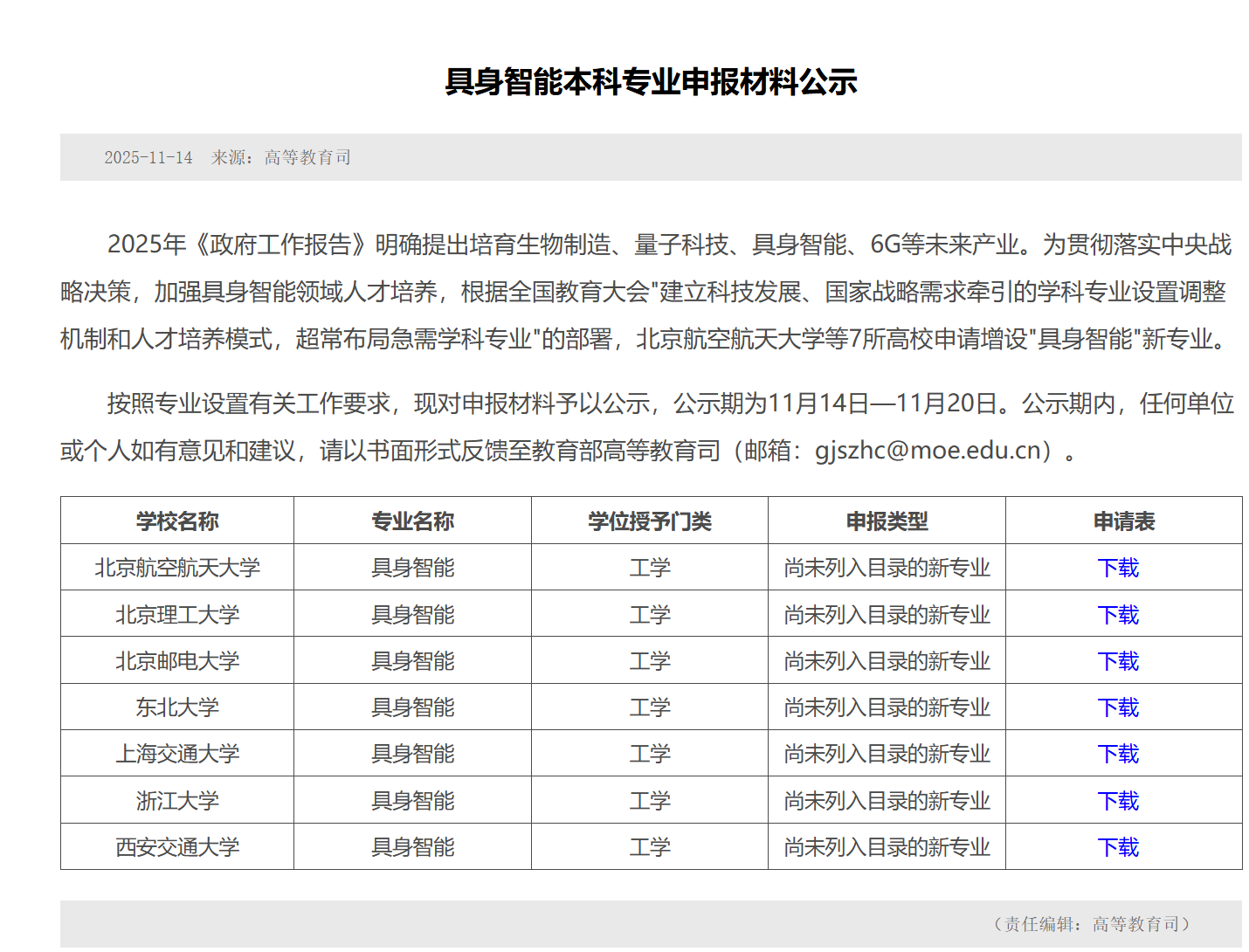 近日,教育部公示重磅申报信息:北京航空航天大学、北京理工大学、北京邮电大学、东北大学、上海交通大学、浙江大学、西安交通大学等7所国内顶尖高校正式申请增设“具身智能”新专业,学位授予门类为工学。此举不仅深度响应2025年《政府工作报告》中培育具身智能等未来产业的战略部署,也意味着该领域人才培养迈入系统化发展阶段。