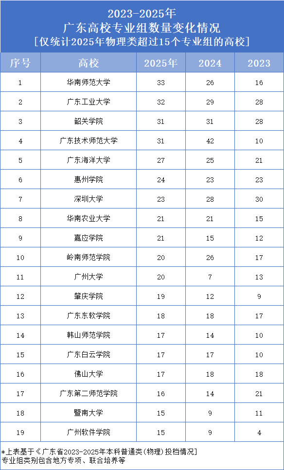 柯大侠整理了2023-2025年广东高校专业组(物理)的数据发现,2025年有19所高校的专业组数量在15个以上,华南师范大学便是其中专业组数量最多的院校,这些高校值得考生关注。结合近3年的数据观察发现,如暨南大学、广州大学等院校,专业组持续“瘦身”。