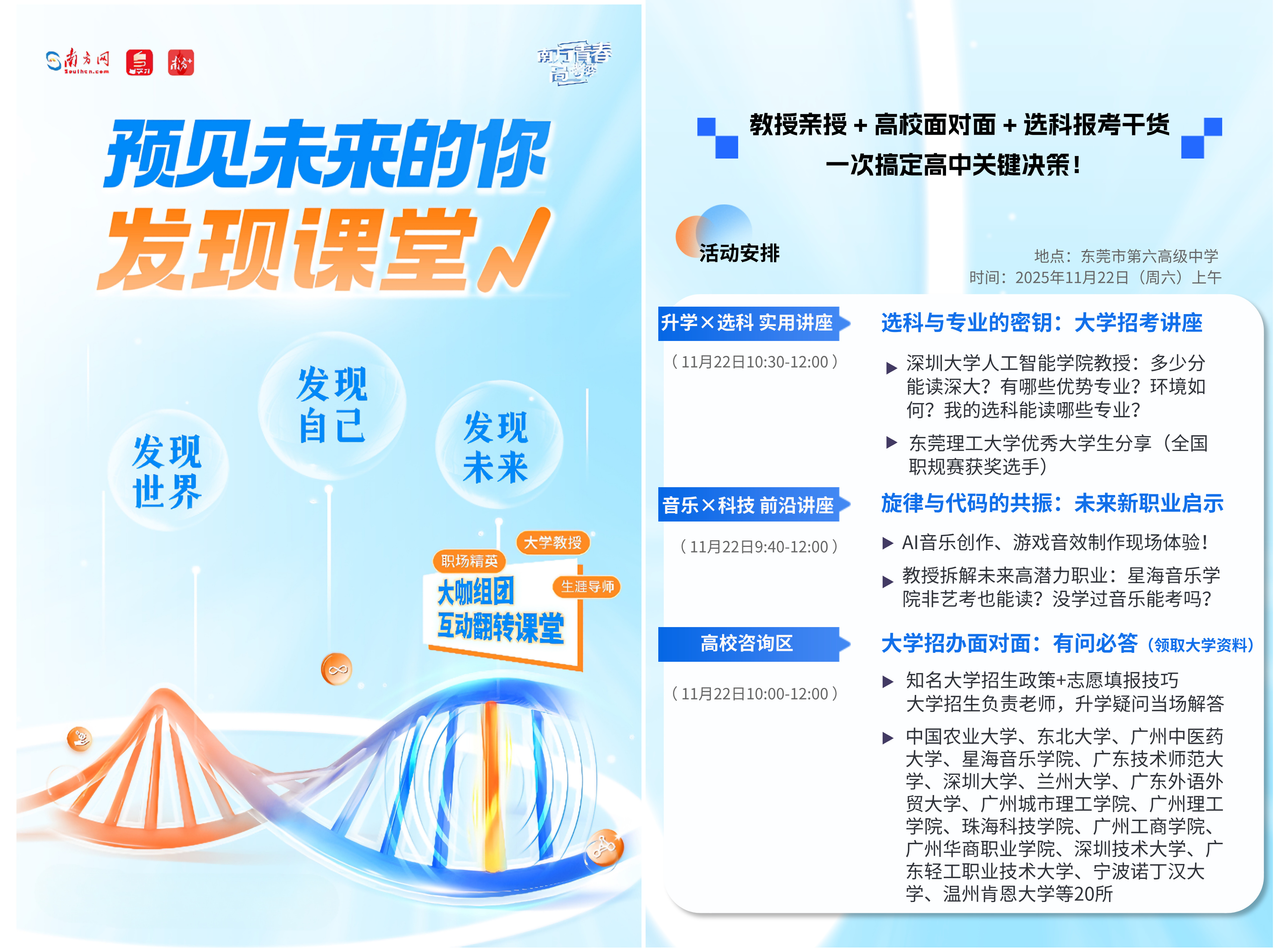 11月22日上午,一场聚焦中学生生涯规划的“预见未来的你・发现课堂”活动将在东莞市第六高级中学举办!该活动由南方新闻网、粤学习客户端、南方+客户端联合主办,东莞市第六高级中学承办 ,将以“选科规划+高考升学政策+职业前景”为核心,助力学子清晰规划成长赛道。现场不仅有嘉宾带来课程分享,还有20所全国知名高校的招生负责人面对面答疑,干货满满。