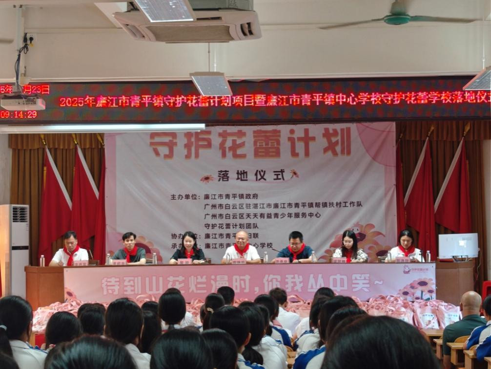 廉江市青平镇中心学校党支部书记李声军现场表态:学校将全力配合项目实施,开放教室、功能室等场地资源,同时引导教师加入“守护计划团队”,当好花蕾使者,与专业力量形成守护合力。